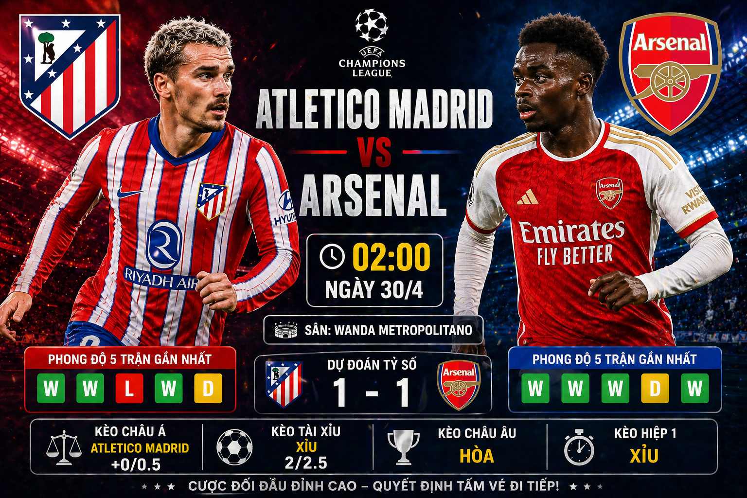 Trận Atletico Madrid vs Arsenal lúc 2h00 ngày 30/4 được dự đoán sẽ rất căng thẳng và chặt chẽ. Atletico Madrid có lợi thế sân nhà, nhưng Arsenal lại có phong độ tốt.