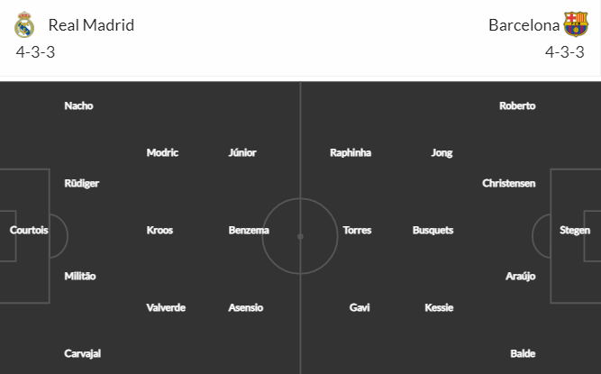 - Real Madrid: Courtois; Carvajal, Militao, Rudiger, Nacho; Camavinga, Tchouameni, Kroos; Valverde, Benzema, Vinicius