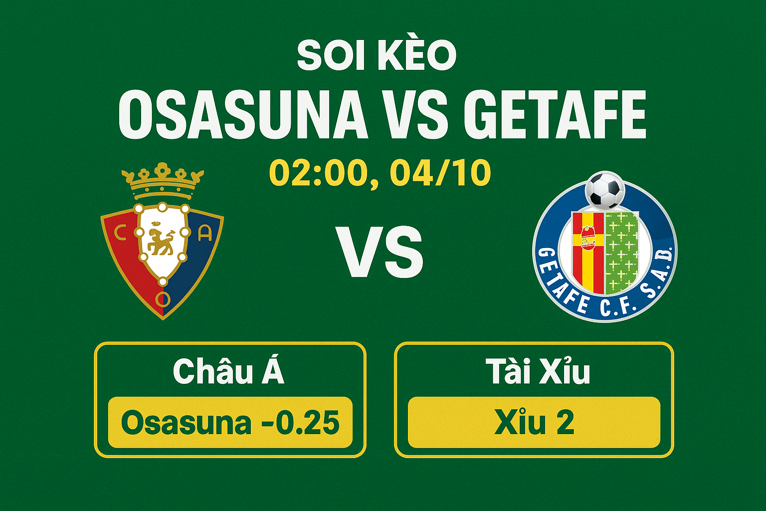 Trận đấu giữa Osasuna vs Getafe diễn ra lúc 2h00 ngày 4/10 trong khuôn khổ vòng 9 La Liga 2025/26 hứa hẹn sẽ mang đến nhiều kịch tính. Cả hai đội bóng đều đang hướng đến mục tiêu trụ hạng và cạnh tranh ở nhóm giữa bảng xếp hạng, do đó cuộc đối đầu này có ý nghĩa quan trọng. Hãy cùng phân tích, soi kèo chi tiết để tìm ra lựa chọn tối ưu nhất cho giới đầu tư.